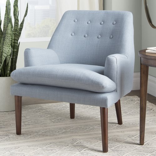 Perfectly at home in contemporary aesthetics, the frame of this piece is crafted from wood, and upholstered with a polyester blend in a solid hue. It features a web suspension seat construction, removable seat cushion, button tufted details, and square arms.