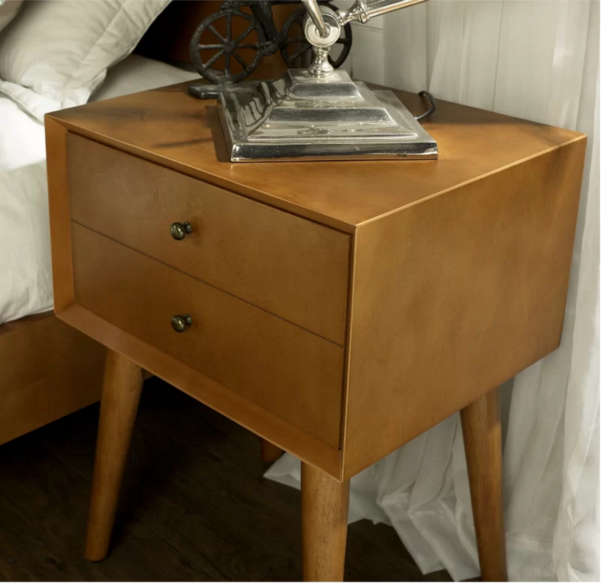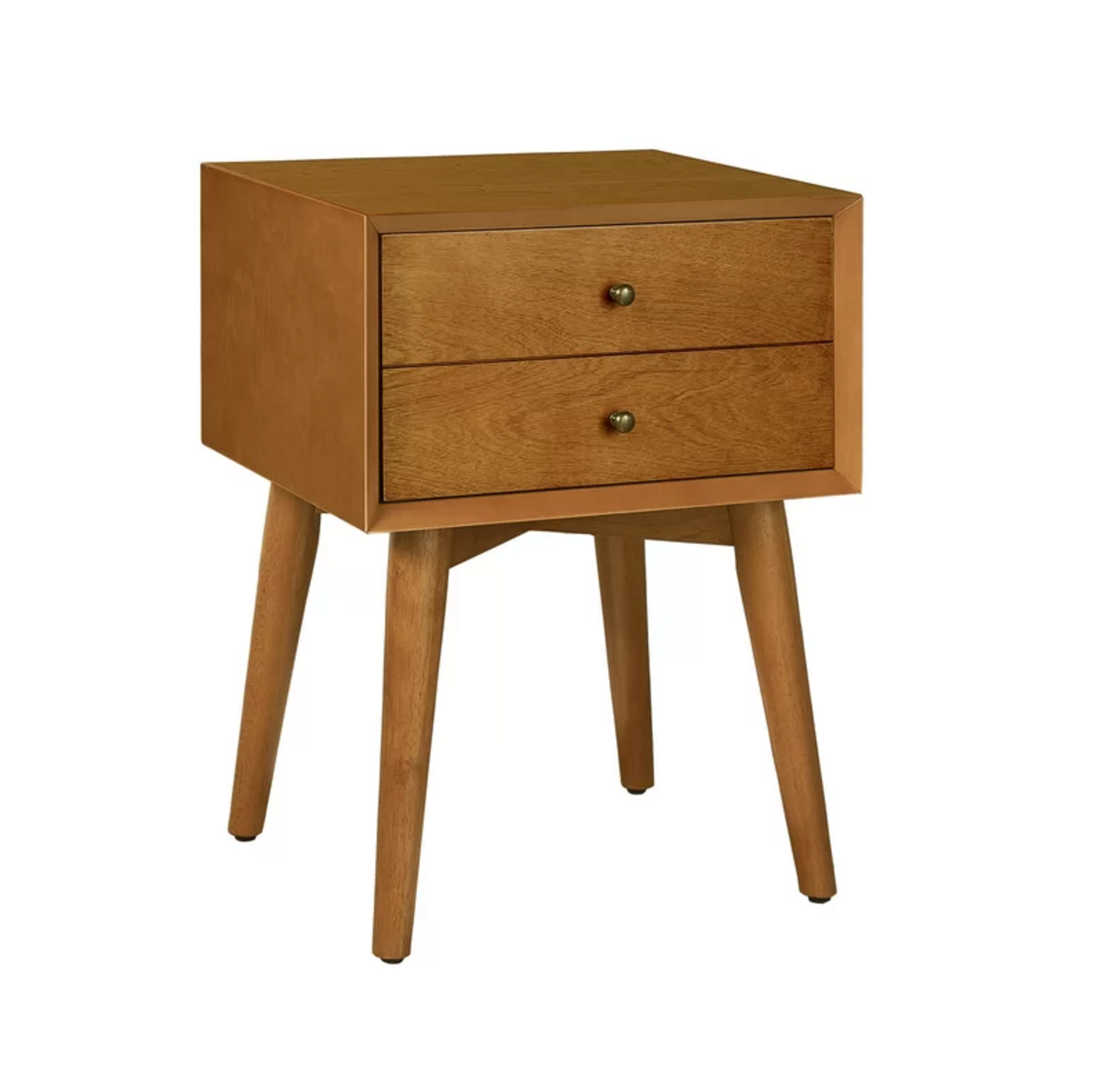 Acting as a nightstand in the bedroom, this end table is ready to offer up space to stage, serve, and stow. Founded atop four angled legs for a nod to mid-century style, its frame is crafted from birch wood and solid wood veneers.