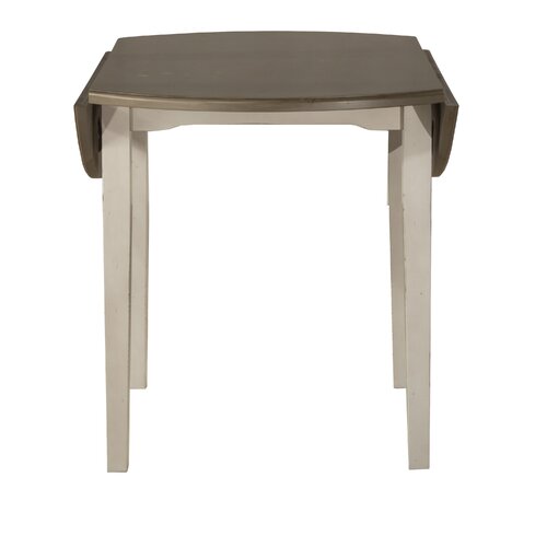 Crafted from a blend of solid and manufactured wood, it features four straight legs and a circular tabletop with a drop leaf mechanism to accommodate more guests.