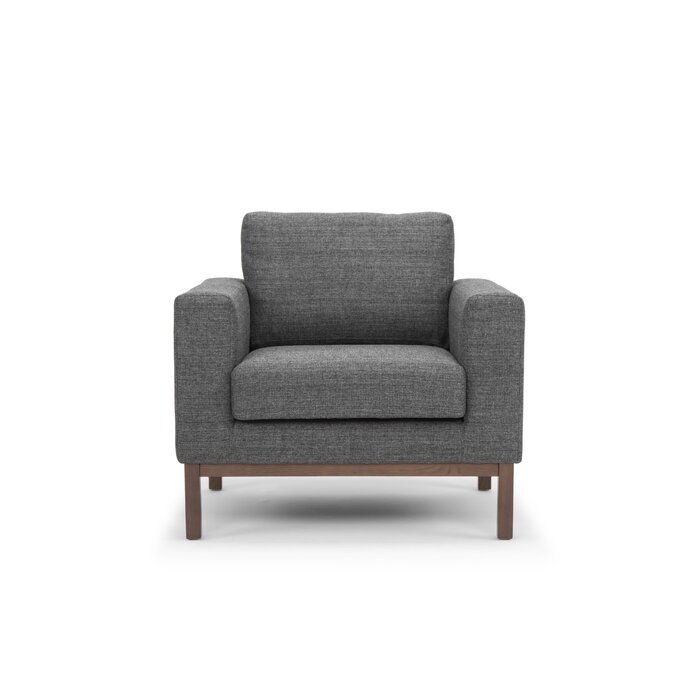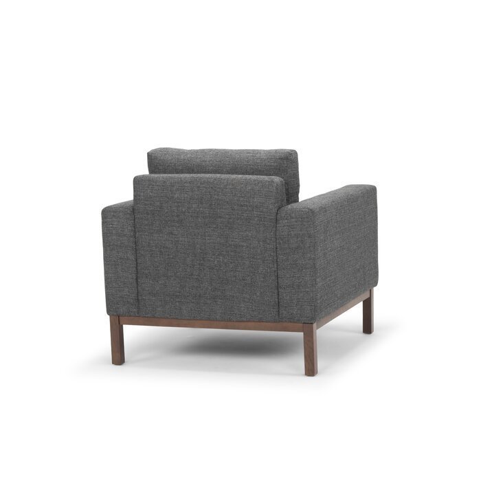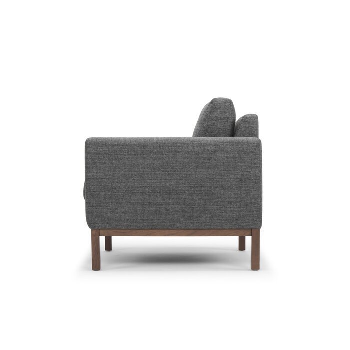 Drawing inspiration from mid century European looks and classic contemporary silhouettes, this piece is an ever-elusive anchor for your living room. The legs are made with solid walnut stained hardwood and the frame is crafted with 100% kiln-dried solid wood and wrapped in soft light grey upholstery.