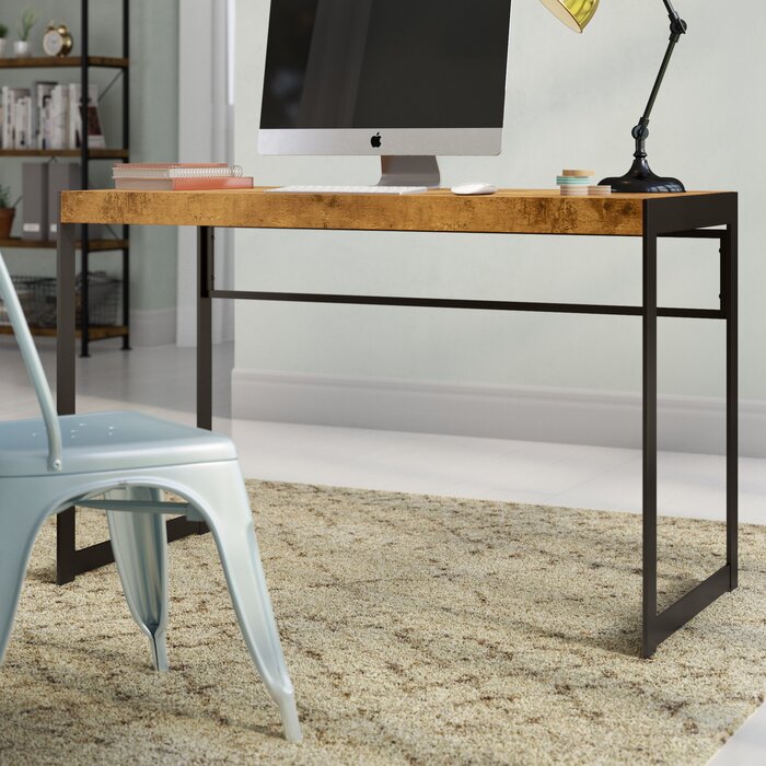 Anchor your home office in on-trend pastoral style with this charming writing desk. Showcasing an openwork sled frame, this streamlined design showcases dark, gunmetal sides and a rustic, rectangular wooden desktop in an antique nutmeg finish.