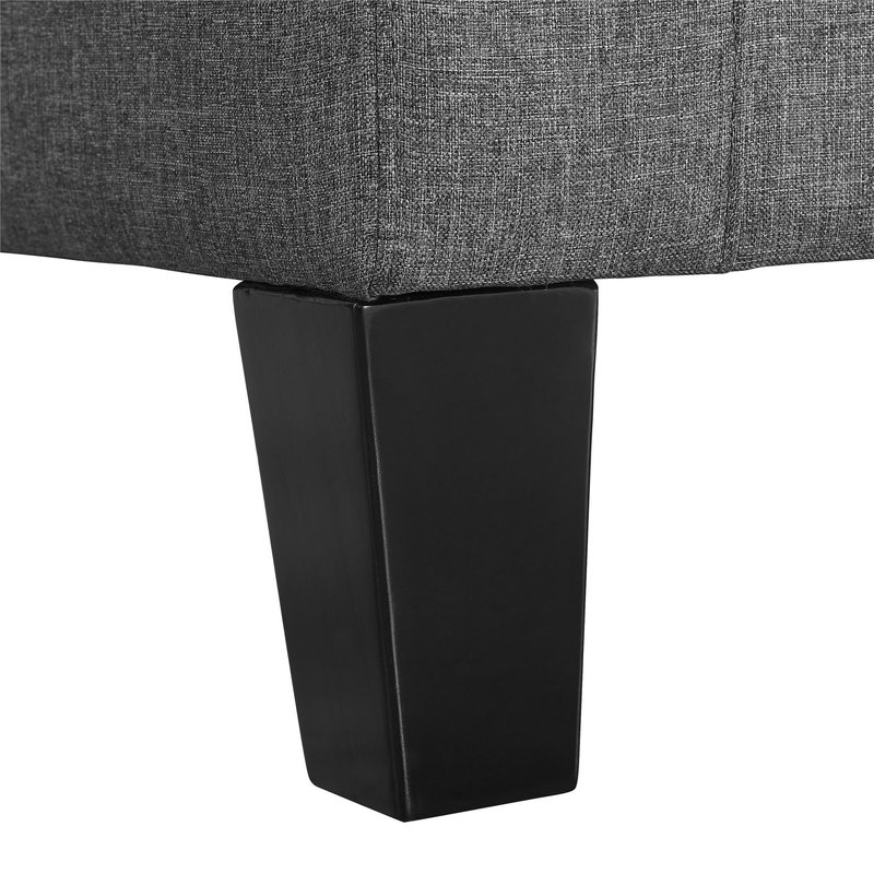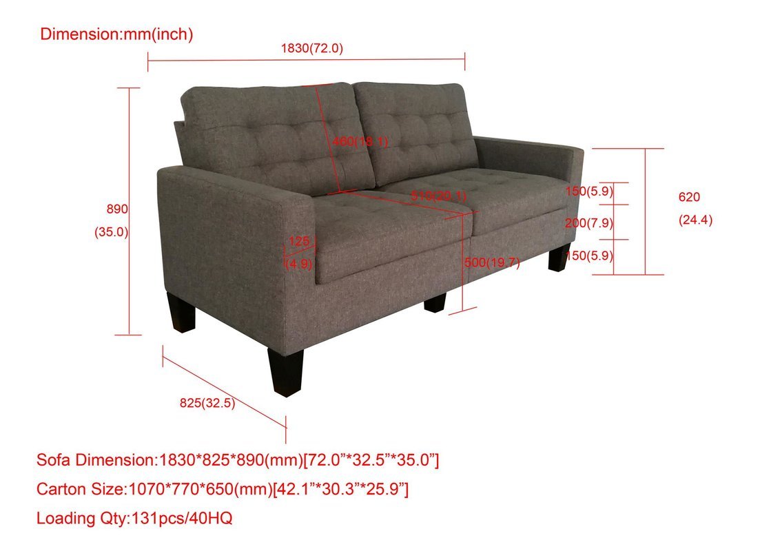 Sophisticated mid-century modern design and approachable contemporary style combine in this compact sofa. Founded on a solid and manufactured wood frame, this dapper design strikes a clean-lined silhouette with a gently-slanted back, track arms, and tapered block feet in a crisp black finish. Brushed gray polyester upholstery envelops the sofa, accented by biscuit tufting and detail stitching, while medium-firm foam padding in the seat cushion and backrest provide comfortable support.
