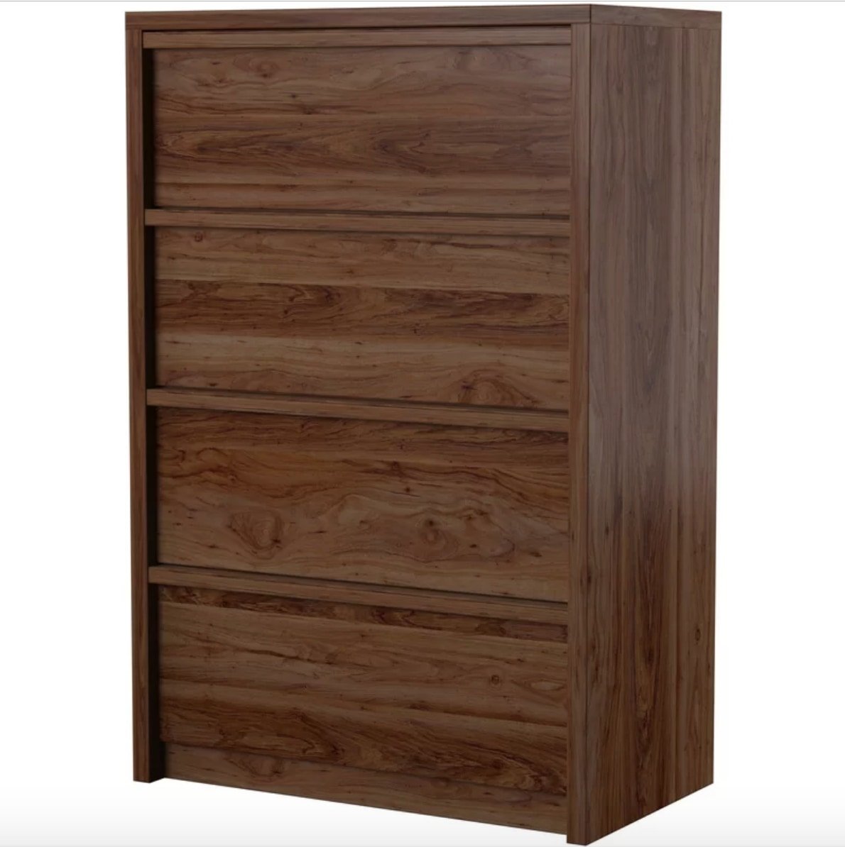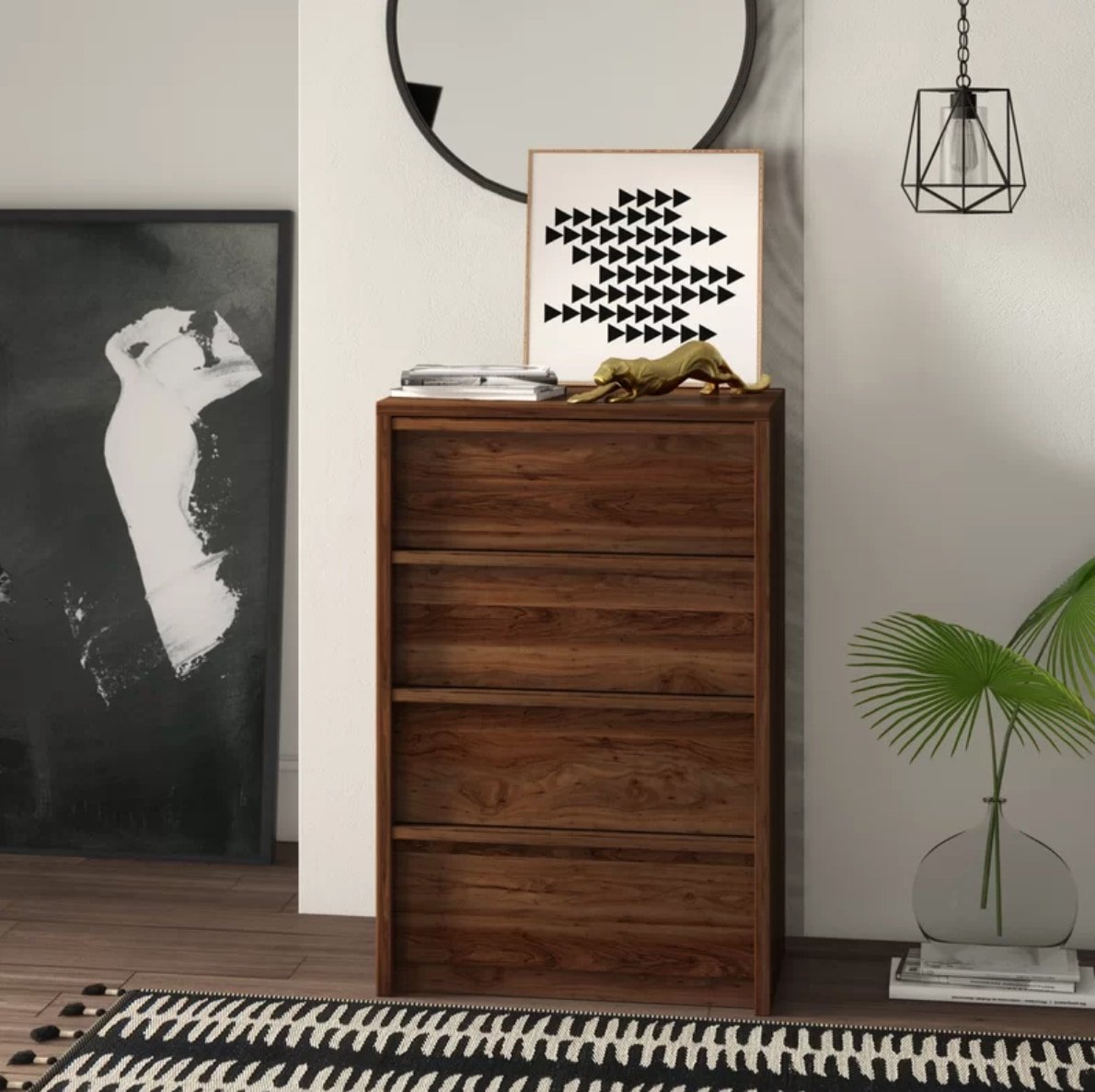 Rugged, yet refined, this four-drawer chest brings streamlined contemporary style to your bedroom. This chest strikes a chunky rectangular silhouette in a grand walnut finish. Set in metal roller glides with safety stops, four drawers with lipped pulls offer plenty of space.