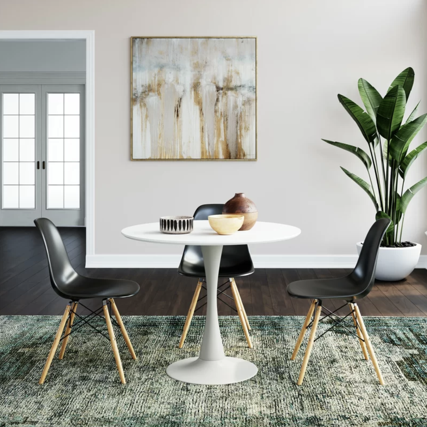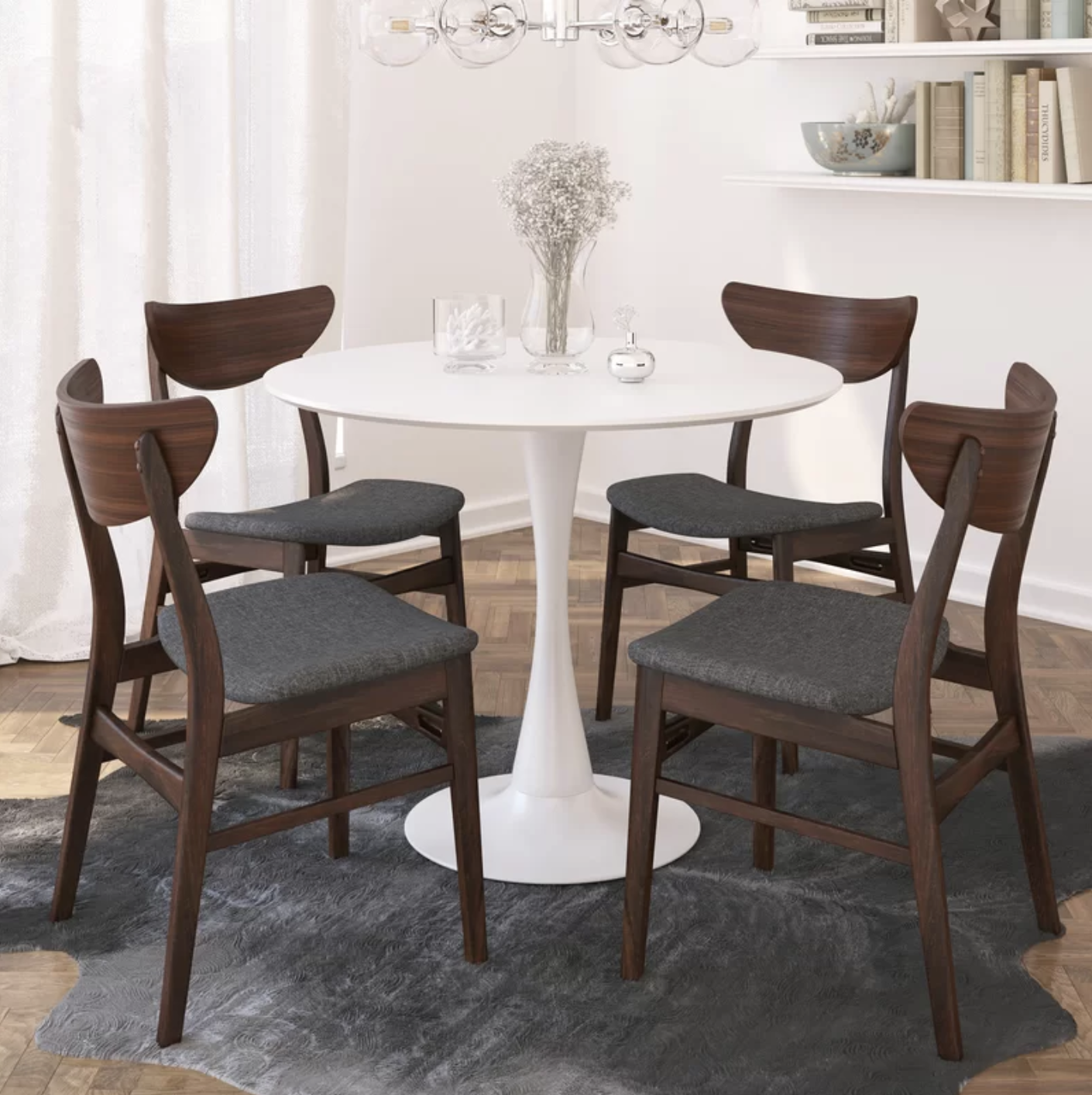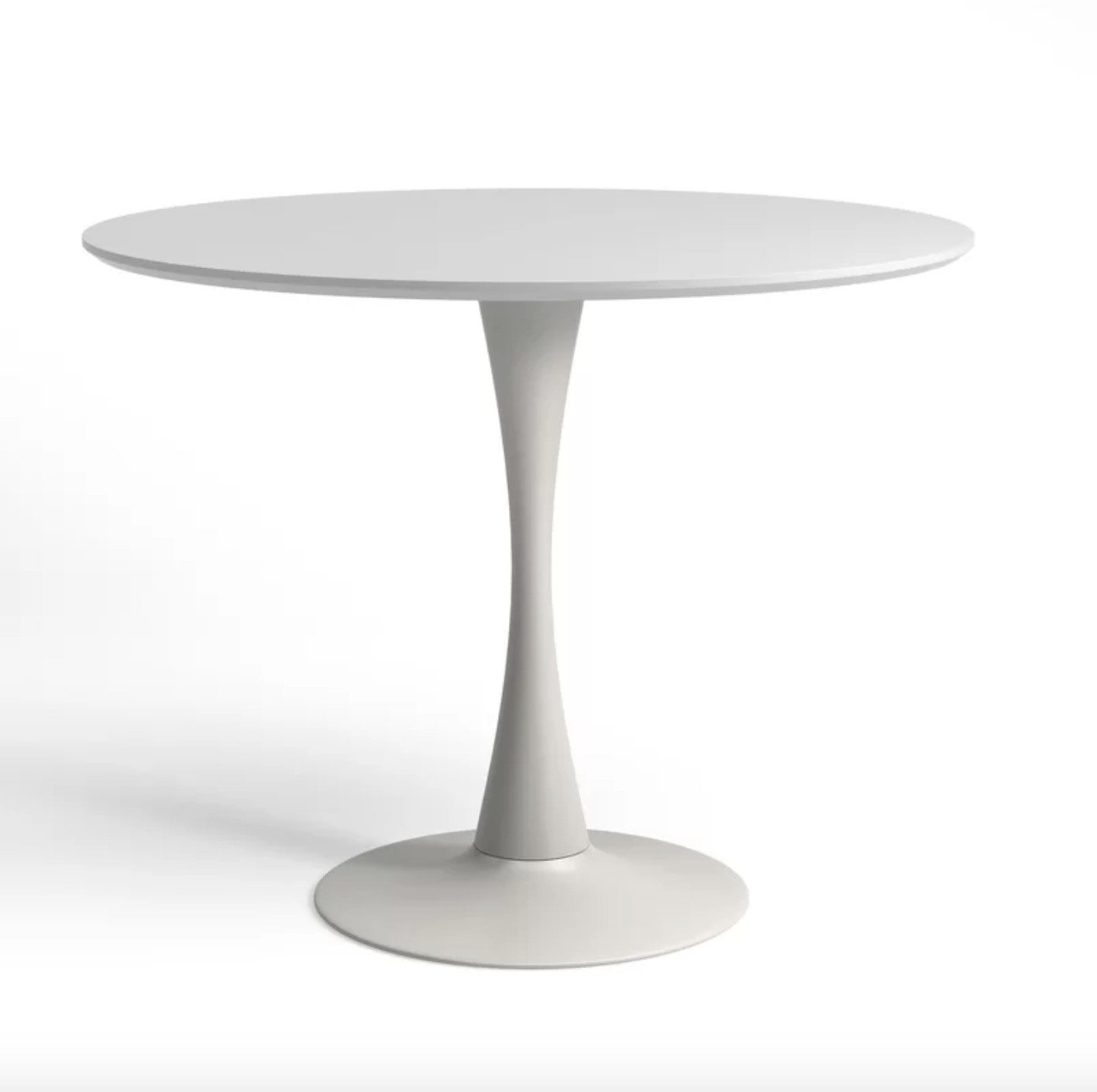 Founded atop a steel pedestal base, its circular top is made from manufactured wood and measures 36″ in diameter to seat four comfortably, so it’s an ideal option for smaller spaces. Though its design is distinctive, this piece is ready to blend with a variety of color palettes and aesthetics thanks to its neutral finish.